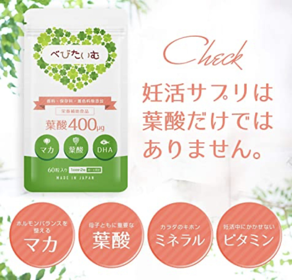 べびたいむは独自の技術を誇る、日本産の葉酸サプリです。葉酸だけではなくマカやミネラル、ビタミンなどバランスよく配合しています。食事だけでは補えなかった栄養素が、簡単に摂取できるのでおすすめです。1日のうち好きなタイミングで摂取できますよ!