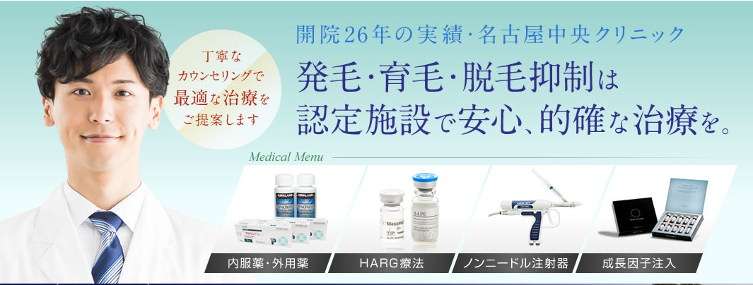 名古屋中央クリニックでは薄毛や抜け毛の症状や原因だけでなく、生活習慣も考慮し、一人ひとりに合った先進の薄毛治療の情報と技術を提供してくれます。